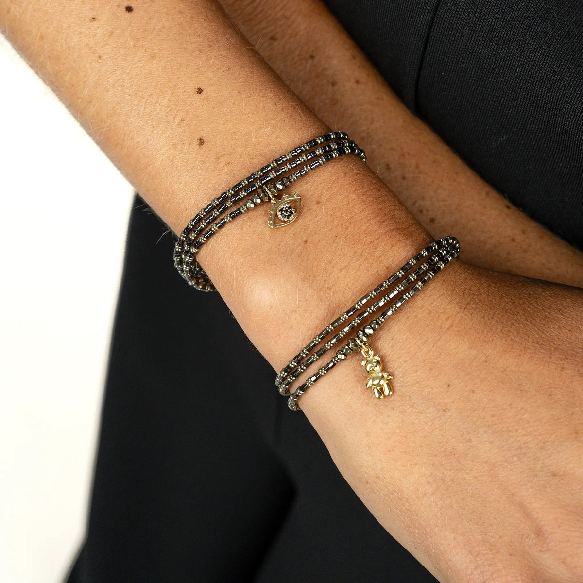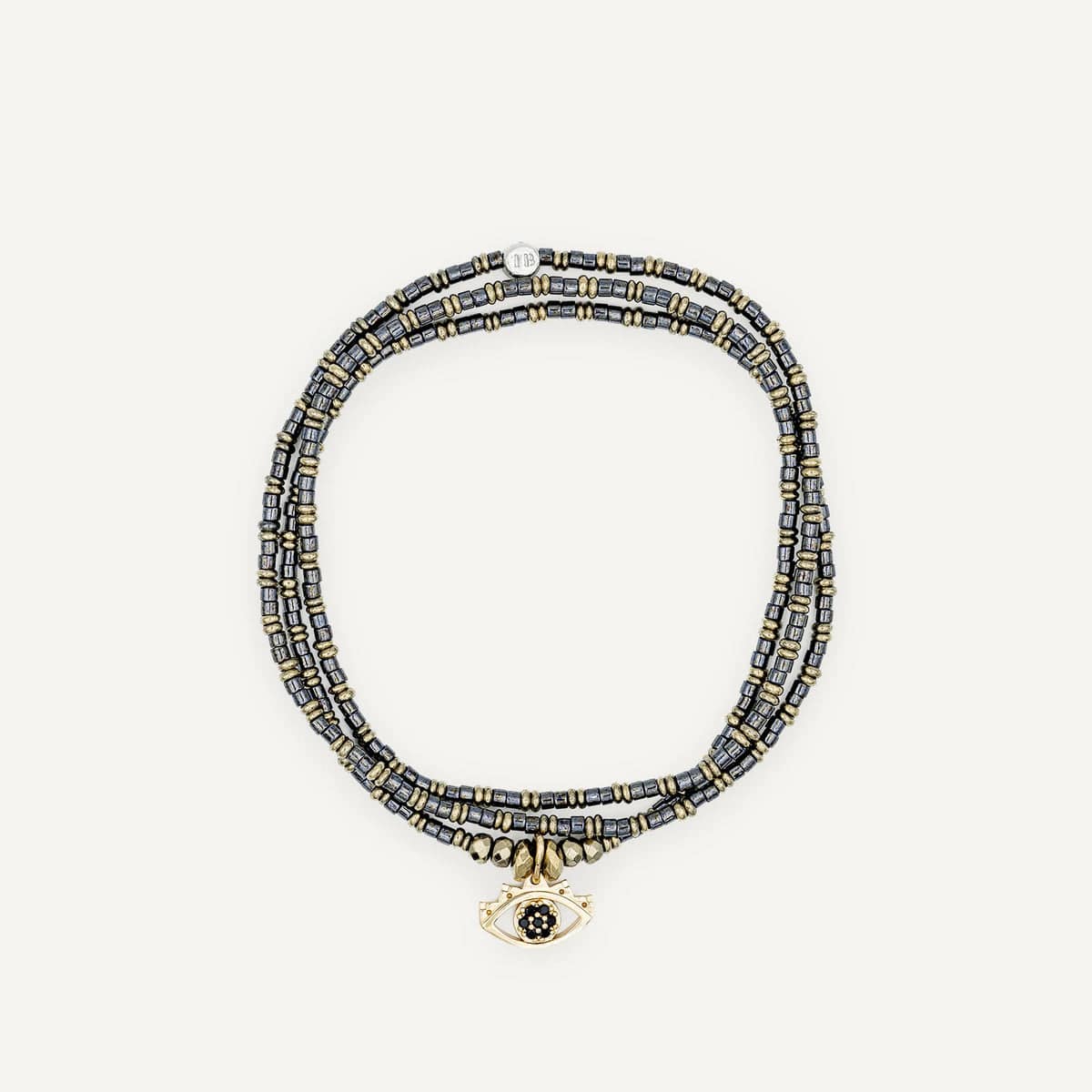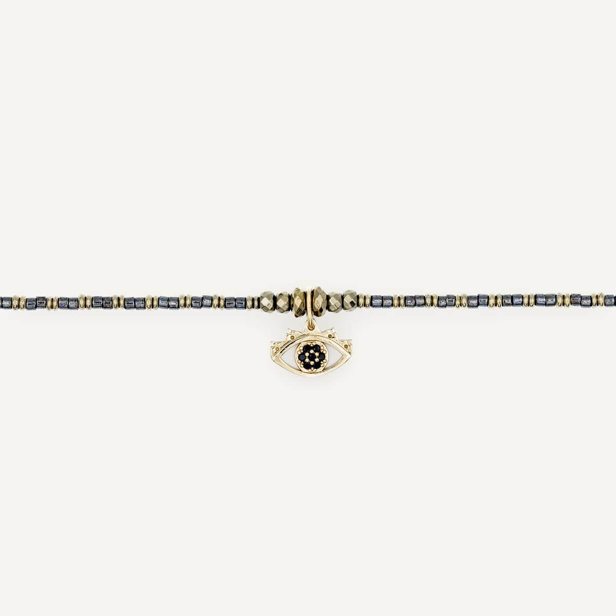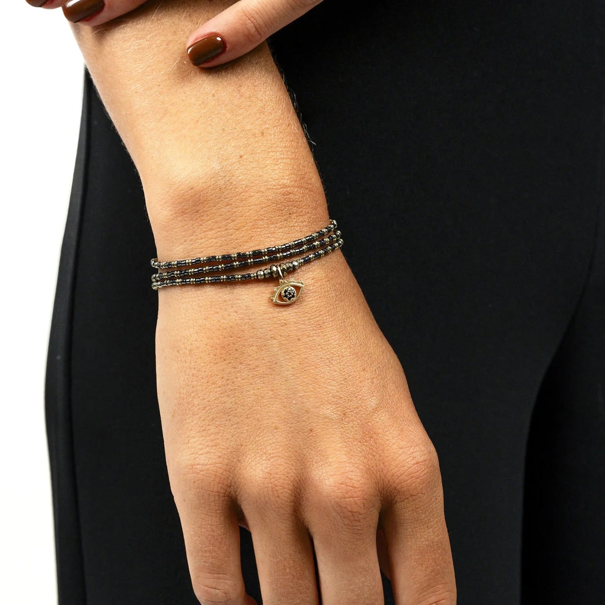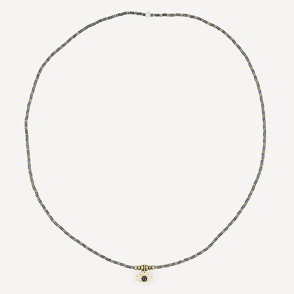 Le bijou est sublimé par un pendentif Oeil de Protection doré à l’or fin, symbole de chance, de vigilance et d’énergie positive. Monté sur un fil à mémoire de forme ultra résistant, le BLACK MATI se porte en collier de 49 cm ou en bracelet triple tour, offrant confort, polyvalence et style modulable.
