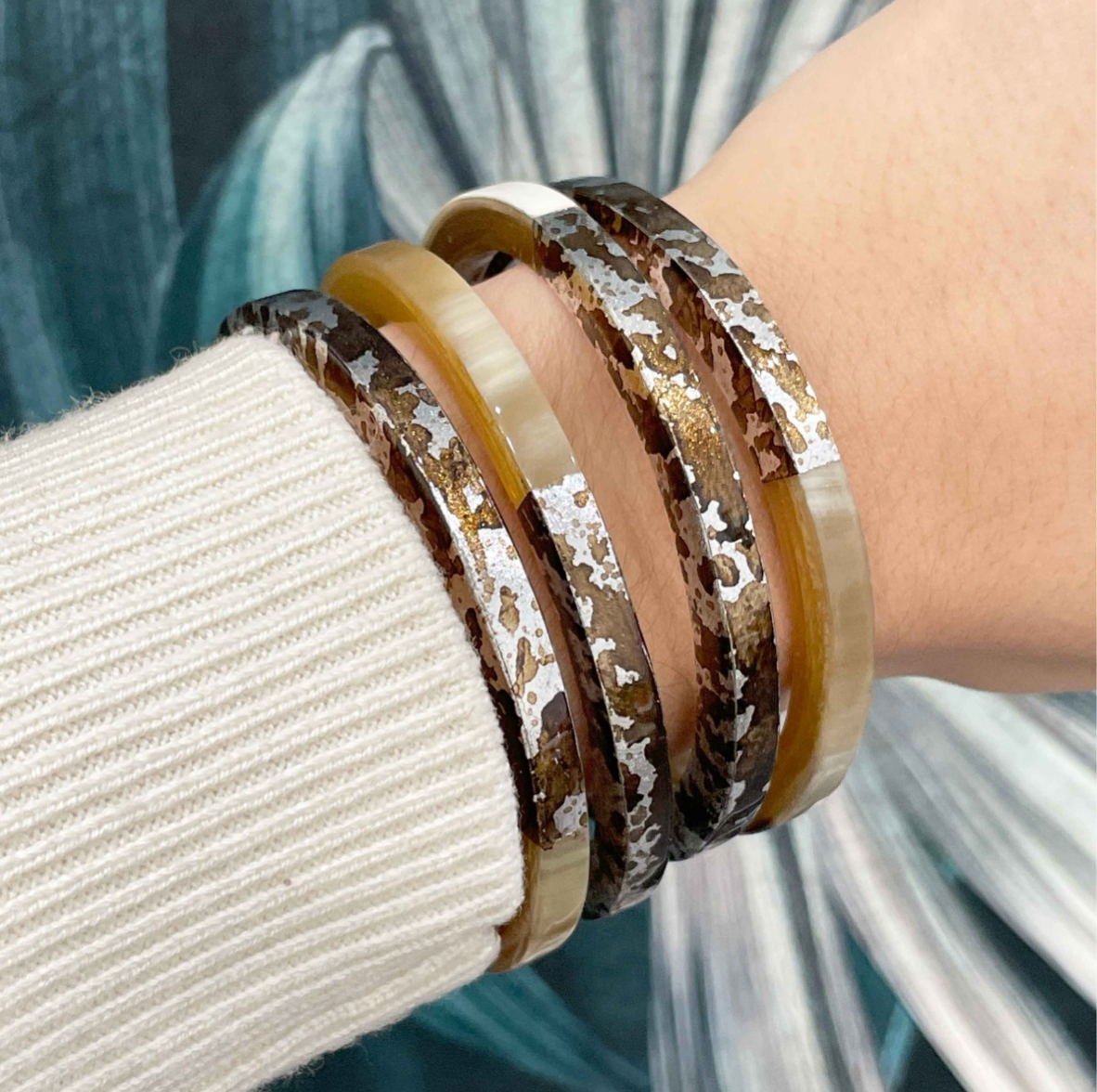 Éclat naturel avec nos joncs carrés en corne léopard argent ! Chaque pièce est un chef-d'œuvre, taillée à la main dans la corne naturelle, offrant une touche de sophistication à votre poignet. Un bijou unique qui allie élégance du doré à la beauté brute de la corne. Sublimez votre style avec ces joncs !