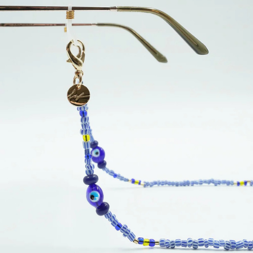 Notre chaîne de lunettes Sola 72 cm, en perles bleues et yeux, médaille gravée LCF, attaches en silicone, habillera élégamment vos lunettes.