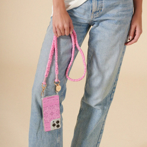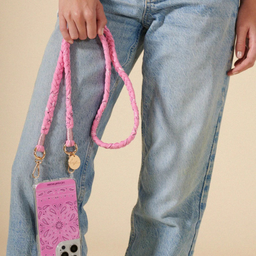 Notre cordon de téléphone tressé de 120 cm, effet denim brut, à mousquetons argentés et médaille gravée LCF, se clipse sur nos coques anneaux ou notre adaptateur universel.