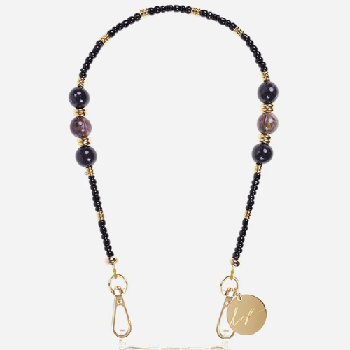 Notre chaîne de téléphone Iris noire, en perles noires, pampilles dorées à l'or fin, longue de 120 cm, se clipse sur nos coques à anneaux ou notre adaptateur avec ses mousquetons dorés. Elle a été conçue à Marseille et fabriquée main.