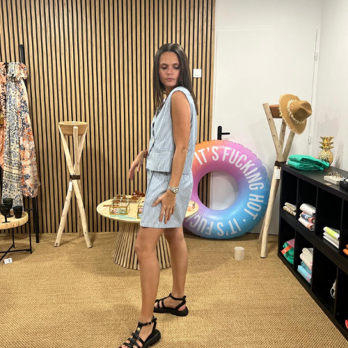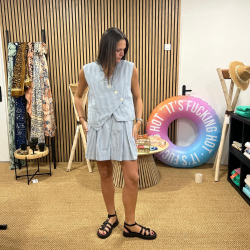 Le short taille haute ou basse, selon vos envies, sublime la silhouette sans sacrifier le confort. Le gilet rayé apporte une touche sophistiquée à ce duo facile à porter ensemble ou séparément.
