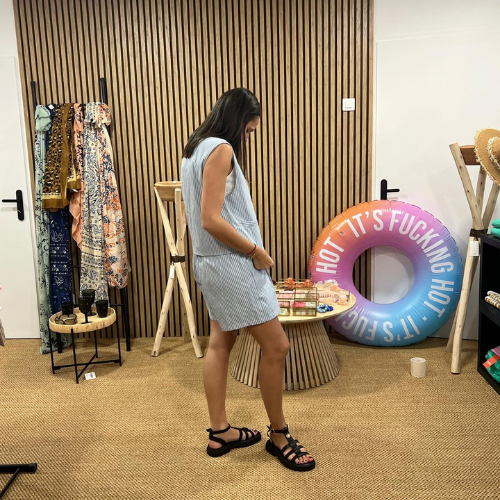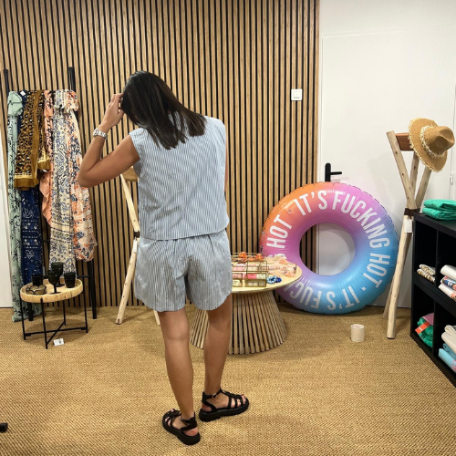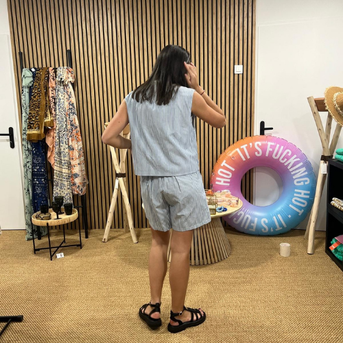 Cap sur l’élégance décontractée avec l’ensemble Riviera, composé d’un gilet sans manches à rayures et d’un short assorti. Sa coupe légère et structurée évoque le charme des journées en bord de mer, tout en s'adaptant à la ville.