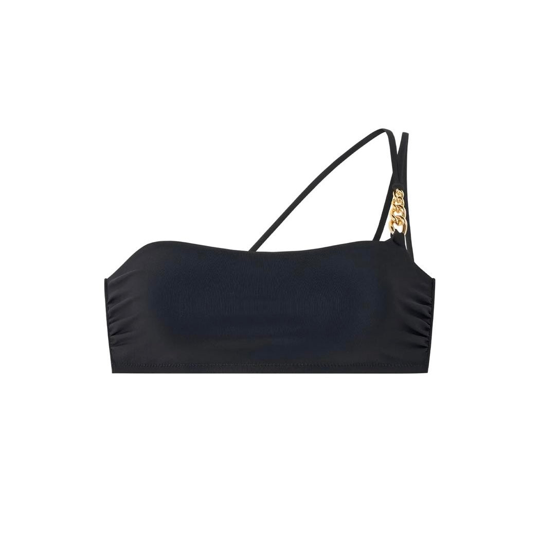 Sa coupe bandeau est structurée par des baleines et des fronces sur les côtés, qui dynamisent et galbent délicatement les courbes. Devant, une gourmette dorée apporte une touche précieuse et élégante, tandis que deux fines bretelles à nouer dans le dos permettent un ajustement multiposition pour un porté personnalisé et graphique.