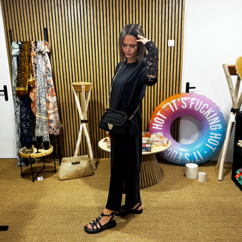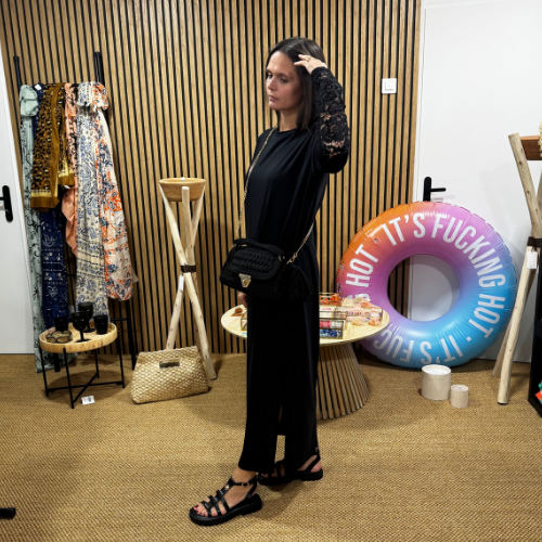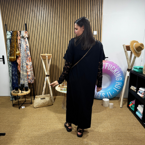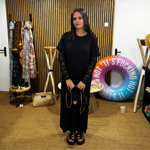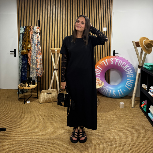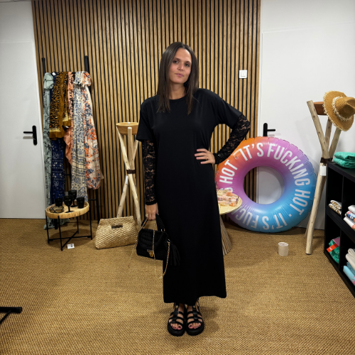 La robe tee-shirt longue Lace Side réinvente le basique avec des manches en dentelle délicate et une fente subtile sur le côté, pour dévoiler juste ce qu’il faut. Sa coupe droite et fluide assure un confort absolu, tout en dessinant une silhouette élancée et moderne.