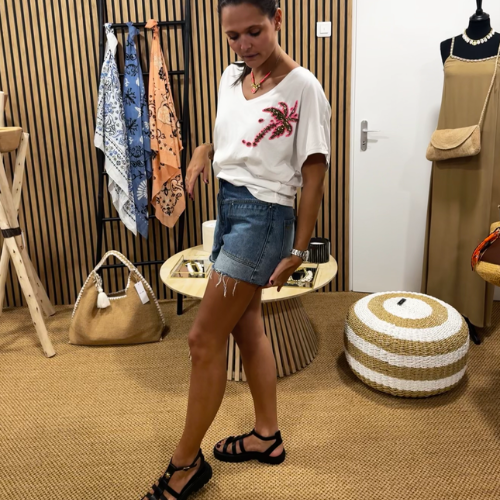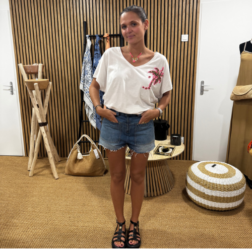 Apportez une touche d'élégance subtile à votre look avec ce tee-shirt blanc, orné d'une broderie en perles représentant un palmier. Avec sa coupe simple et son détail raffiné, ce tee-shirt allie confort et style. La broderie en perles ajoute une dimension chic et tropicale, parfaite pour l'été ou une escapade au bord de la mer. Associez-le à un jean ou une jupe pour un look à la fois décontracté et sophistiqué. Un essentiel de votre garde-robe pour une allure fraîche et élégante.