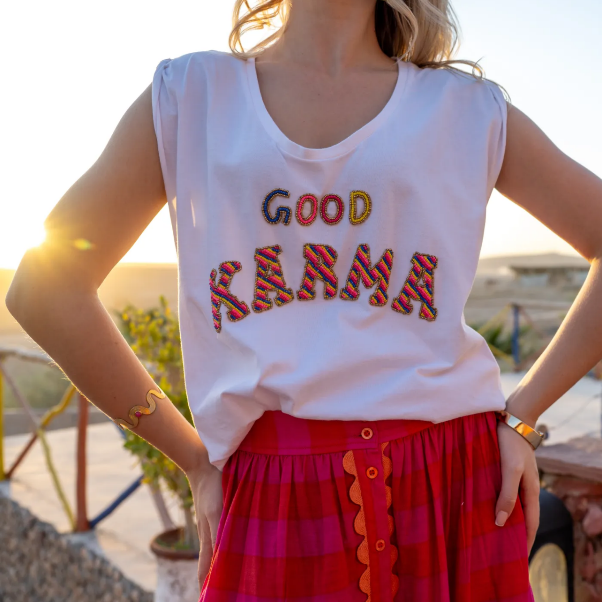 Le t-shirt à col V “Good Karma” est sublimé par une inscription en perles et des détails scintillants, apportant une touche positive et tendance à vos tenues.